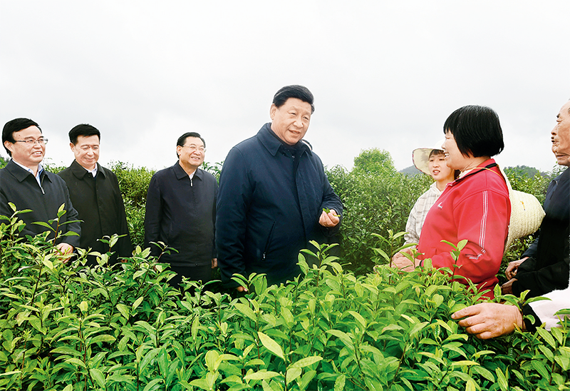 2020年4月20日至23日,中共中央总书记、国家主席、中央军委主席习近平在陕西考察。这是4月21日,习近平在安康市平利县老县镇蒋家坪村女娲凤凰茶业现代示范园区,同茶农们亲切交谈。新华社记者 谢环驰/摄