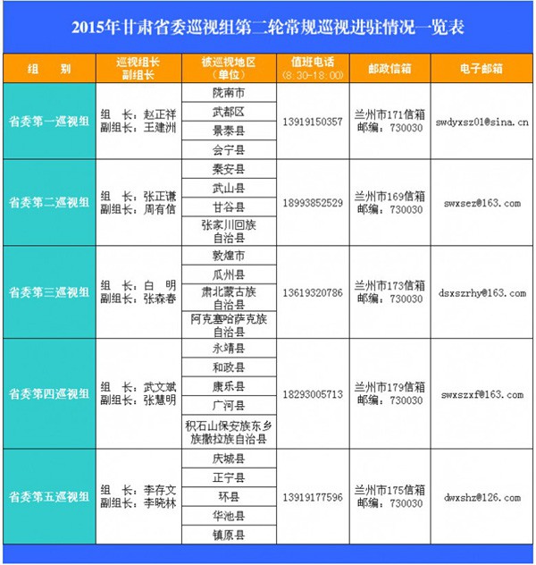 根据甘肃省委统一部署,从7月中旬开始省委5个巡视组陆续进驻被巡视市、县(市、区)开展2015年第二轮常规巡视(省委第一巡视组将于8月15日左右进驻陇南市巡视)。目前,第二轮巡视已经全面启动,计划年内完成所有市州和县市区巡视;同时开展短平快、点穴式的专项巡视,今年内将实现对省属骨干企业巡视的全覆盖。